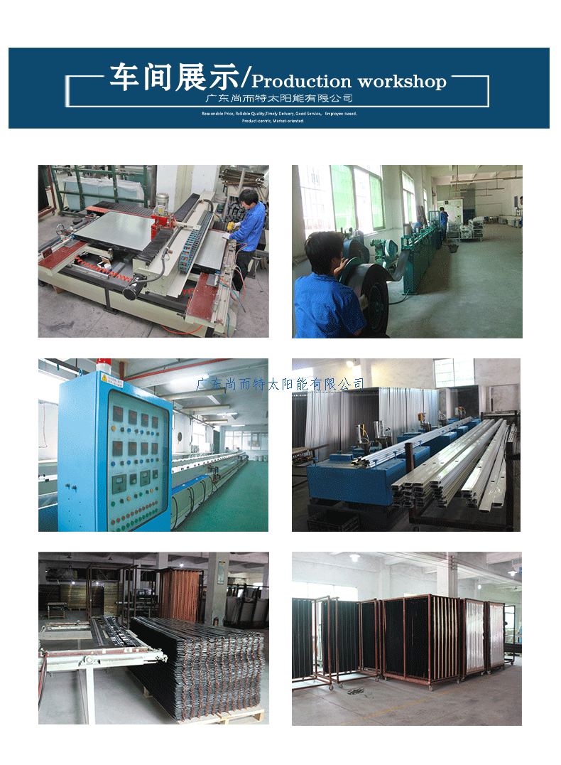 5、玻璃的自爆率低:平板太陽能集熱器采用高純度原材料,相對普通玻璃不含各種引爆雜質,從而大大降低了鋼化后的自爆率。顏色一致性:超白玻璃采用先進的色度分析儀和分析軟件,確保了玻璃顏色的一致性。可見光透過率高,通透性好:大于93%的可見光透過率,使平板太陽能集熱器得到更多太陽能量。紫外線透過率低:降低對其他材料的老化影響;