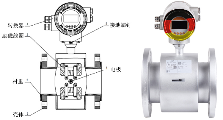 電磁流量計測量原理是基于法拉第電磁感應定律。流量計的測量管是一內襯絕緣材料的非導磁合金短管。兩只電極沿管徑方向穿通管壁固定在測量管上。其電極頭與襯里內表面基本齊平。勵磁線圈由雙向方波脈沖勵磁時,將在與測量管軸線垂直的方向上產生一磁通量密度為B的工作磁場。此時,如果具有一定電導率的流體流經測量管,將切割磁力線感應出電動勢E。電動勢E正比于磁通量密度B、測量管內徑d與平均流速V的乘積,電動勢E(流量信號)由電極檢出并通過電纜送至轉換器。轉換器將流量信號放大處理后,可顯示流體流量,并能輸出脈沖,摸擬電流等信號,用于流量的控制和調節(jié)。