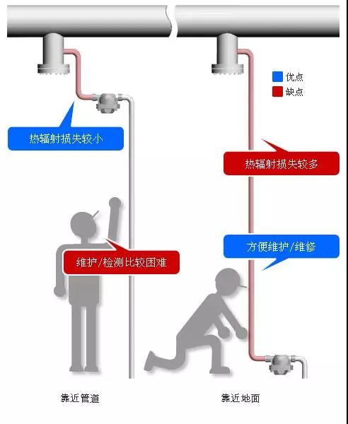 缺點:作為蒸汽主管的延伸,向下的垂直管道越長意味著熱輻射損失越多。(在不影響疏水閥運行的前提下,可以通過安裝保溫來減少熱輻射損失)